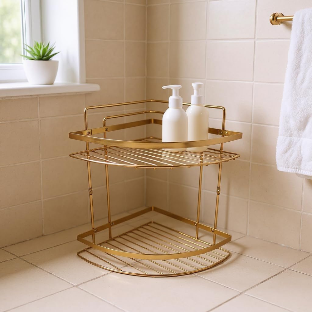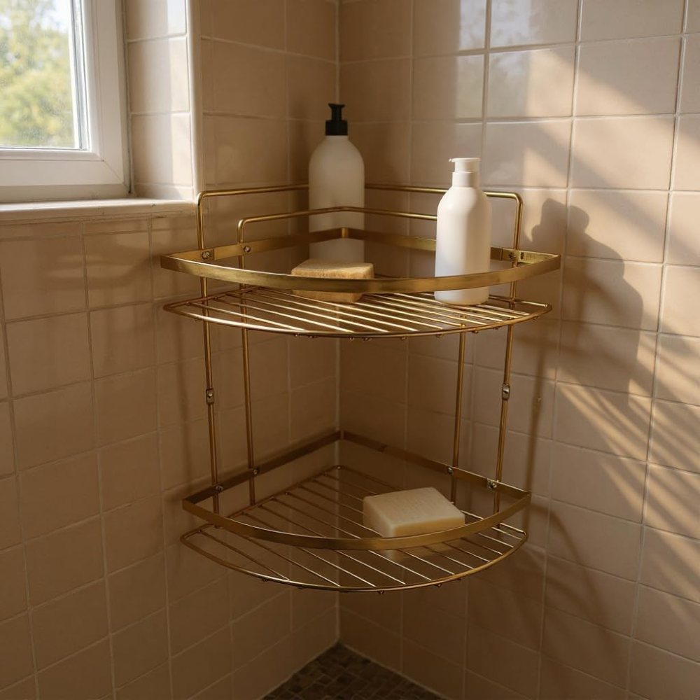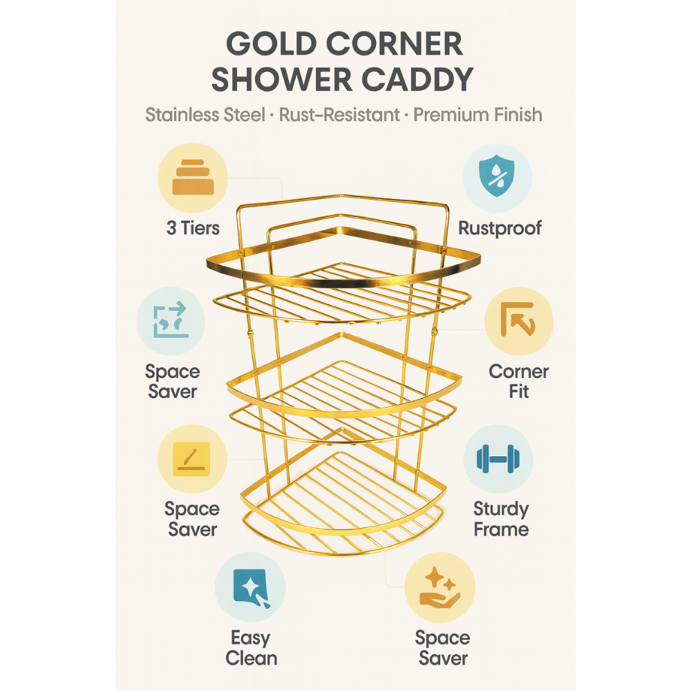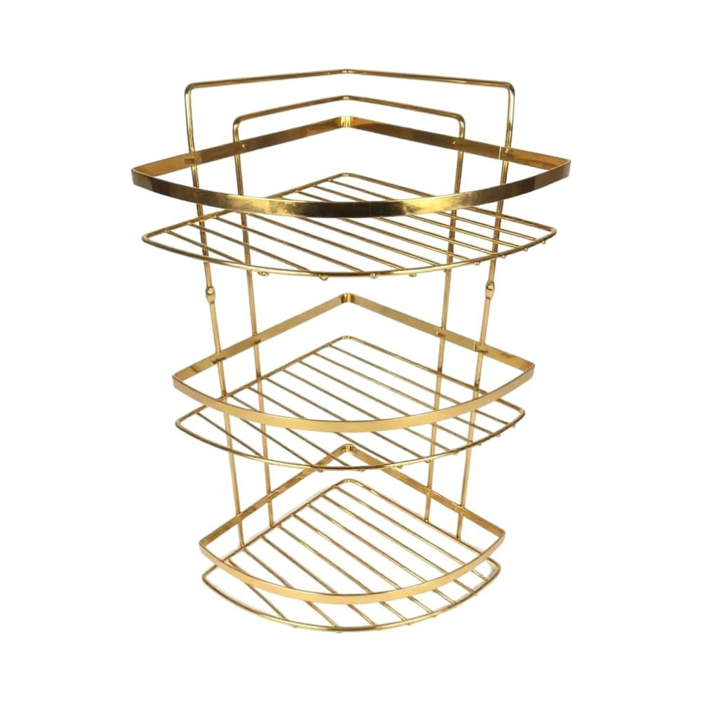 • تصميم الزاوية يوفر مساحة دش غير مستخدمة • فولاذ مقاوم للصدأ مع لمسة نهائية ذهبية مصقولة • رفوف الشبكة المفتوحة تصرف المياه بسرعة • مثبت على الحائط؛ يتضمن مسامير ومثبتات • الخيارات: 1/2/3 طبقات لسعة مرنة • تساعد القضبان الملساء على منع انزلاق العناصر