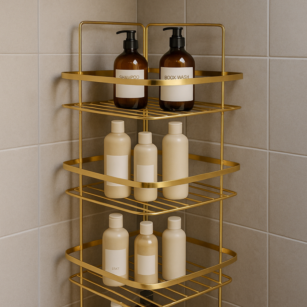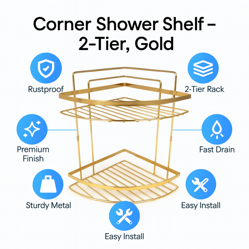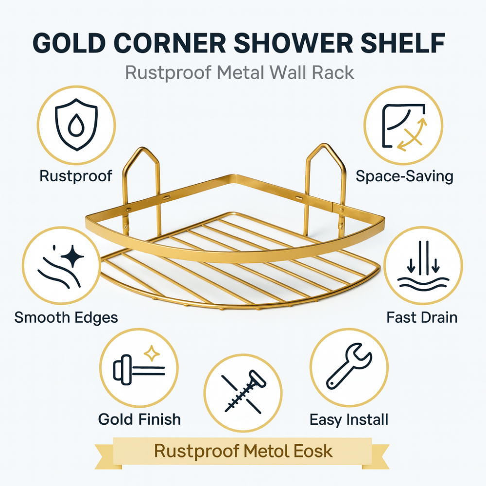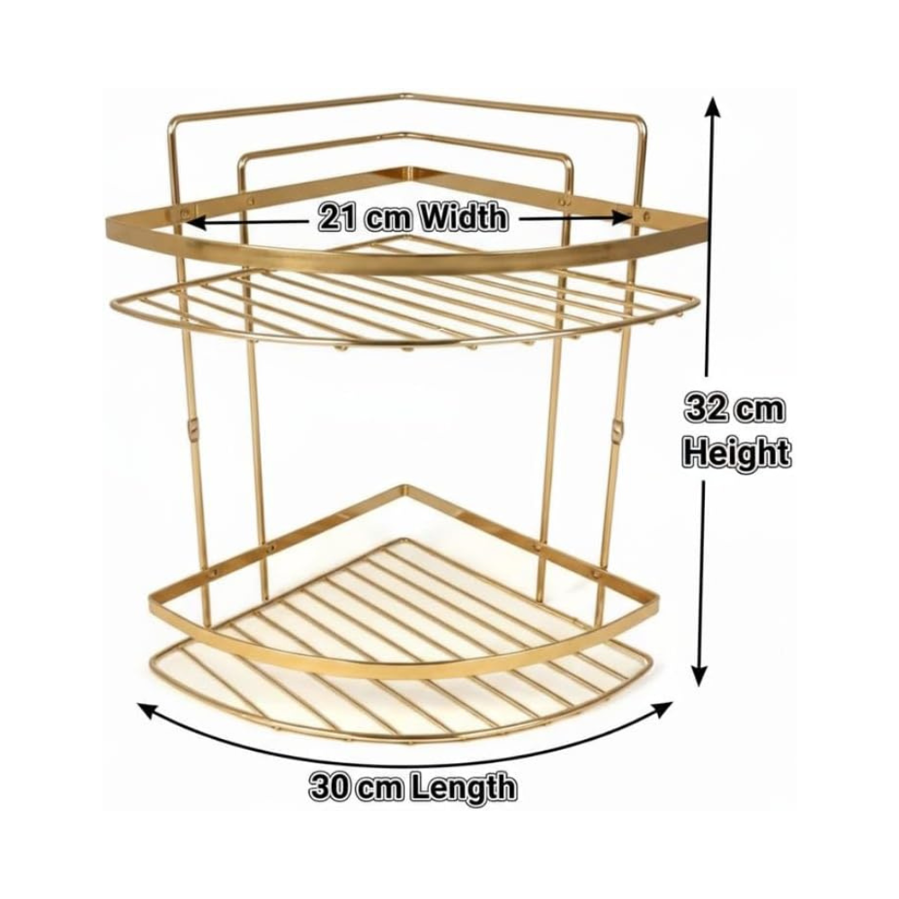 • تصميم الزاوية يوفر مساحة دش غير مستخدمة • فولاذ مقاوم للصدأ مع لمسة نهائية ذهبية مصقولة • رفوف الشبكة المفتوحة تصرف المياه بسرعة • مثبت على الحائط؛ يتضمن مسامير ومثبتات • الخيارات: 1/2/3 طبقات لسعة مرنة • تساعد القضبان الملساء على منع انزلاق العناصر