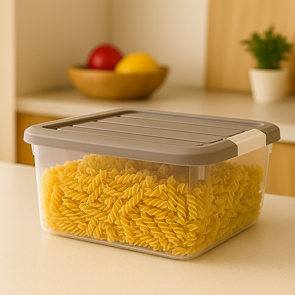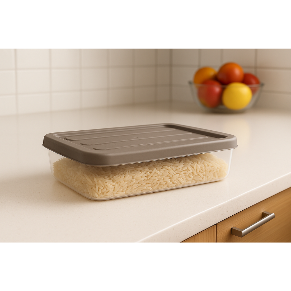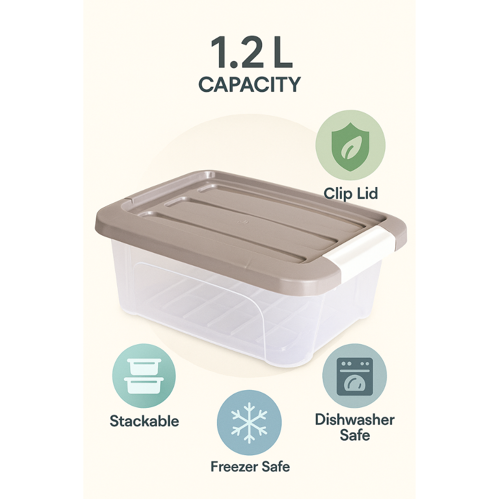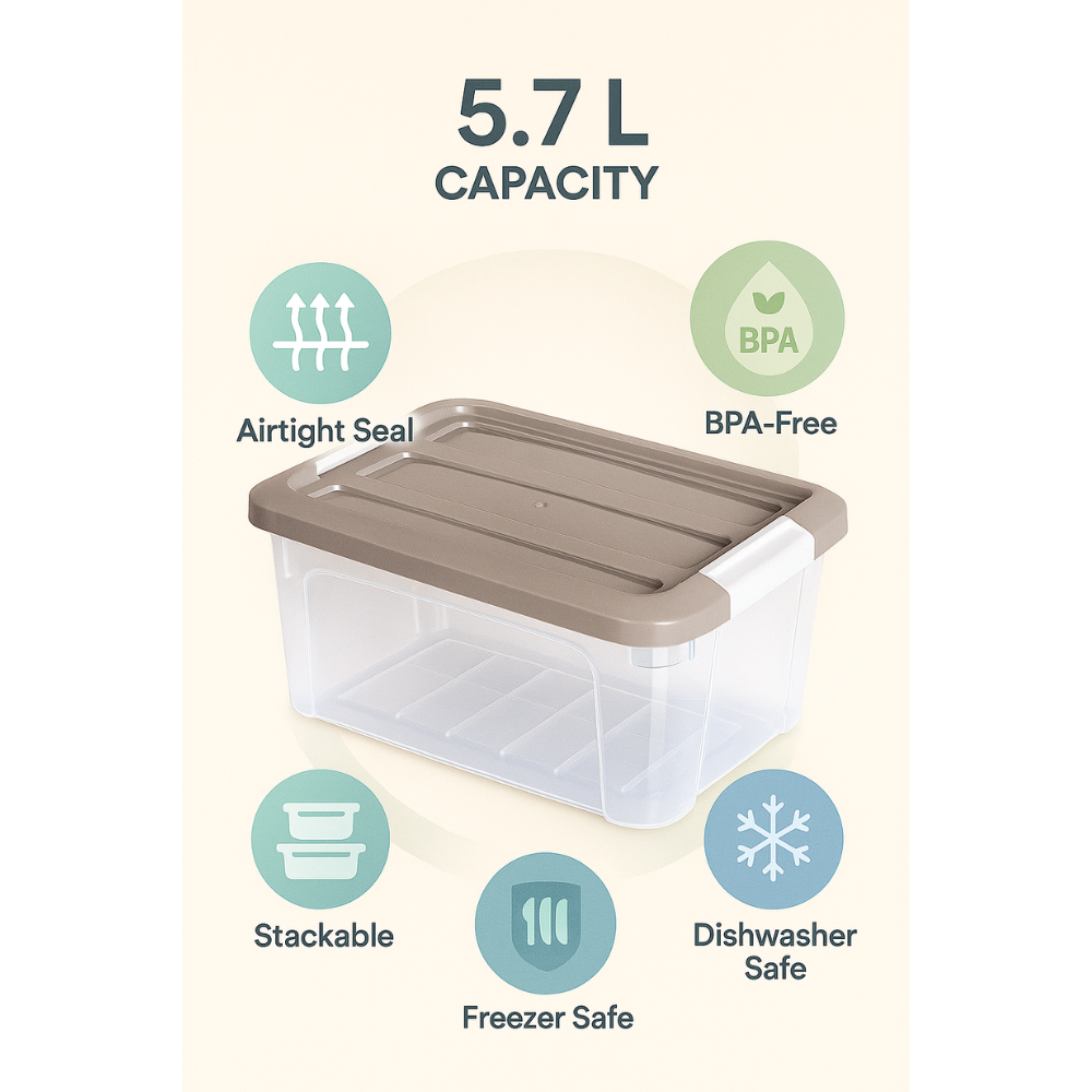 مواصفات المنتج • العلامة التجارية: عامة • السعة/الحجم: 1.2 لتر / 5.7 لتر • المواد: بلاستيك شفاف (آمن للطعام) • مميزات خاصة: غطاء محكم الإغلاق، آمن للفريزر وغسالة الأطباق، قابل للتكديس • اللون: غطاء بيج، جسم شفاف