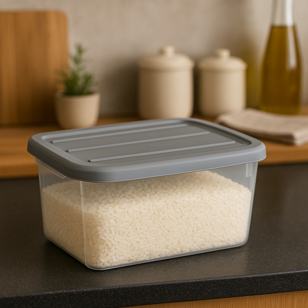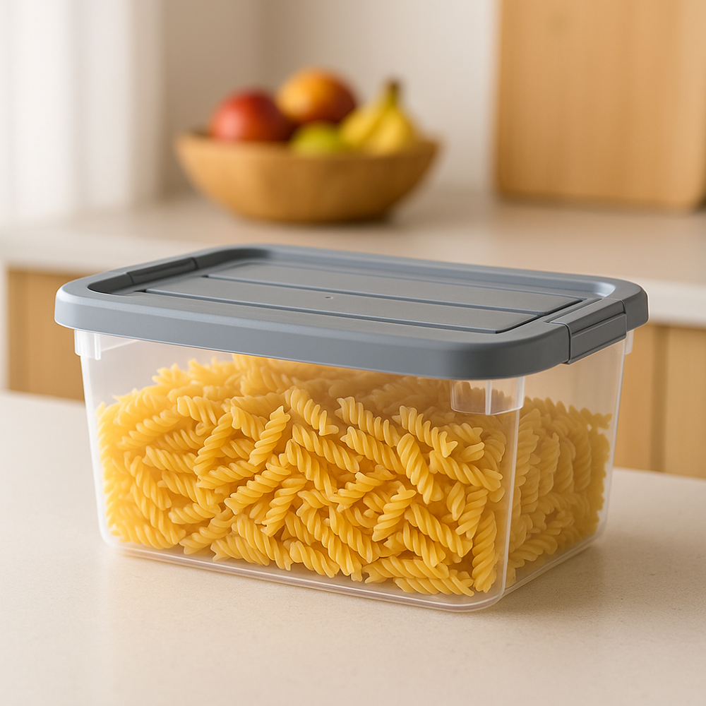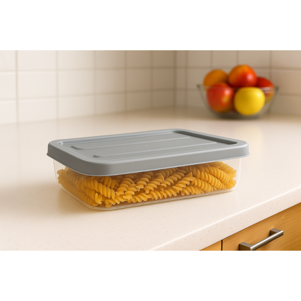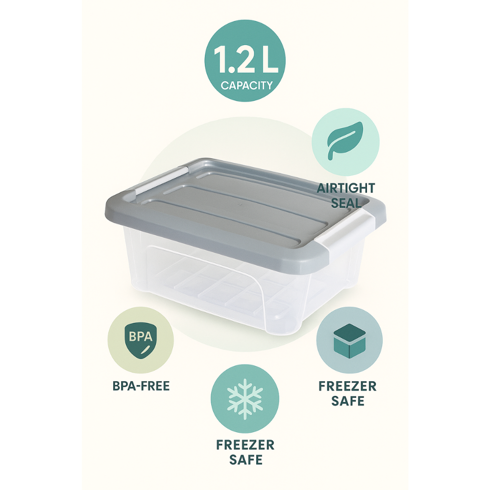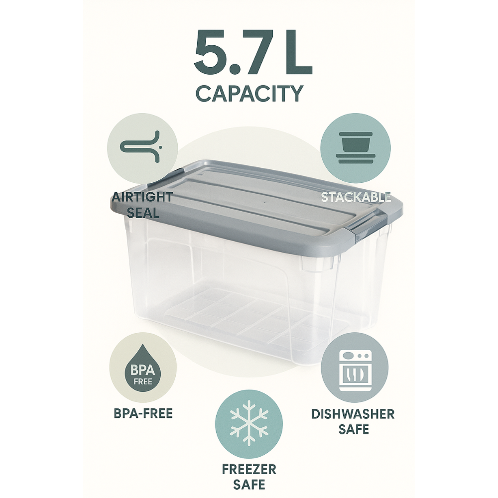 مواصفات المنتج • العلامة التجارية: عامة • الأحجام/السعات: 1.2 لتر / 5.7 لتر • المادة: بلاستيك شفاف (آمن للطعام) • مميزات خاصة: غطاء محكم الإغلاق، آمن للفريزر وغسالة الأطباق، قابل للتكديس • اللون: غطاء رمادي مع جسم شفاف