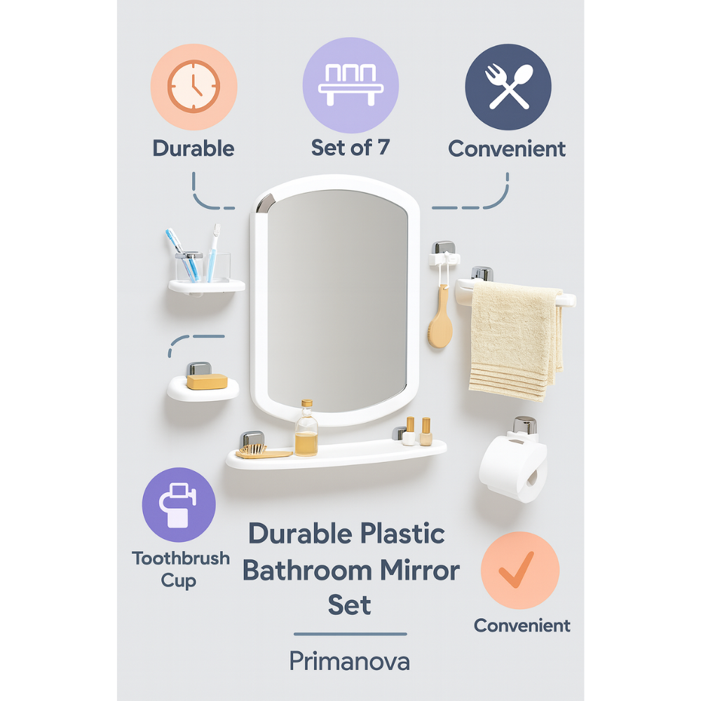 طقم الحمام هذا من بريمانوفا، المكون من 7 قطع، يتضمن مرآة بلاستيكية متينة وإكسسوارات حائط أساسية للاستخدام اليومي المنظم. تظهر كلمة "طقم مرايا الحمام" بشكل طبيعي في البداية. مصمم باللون الأبيض الناصع، يناسب الحمامات المصرية العصرية، ويوفر مساحة تخزين عملية للمناشف والصابون والمناديل ومستحضرات التجميل.
