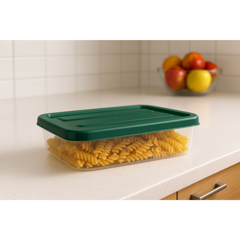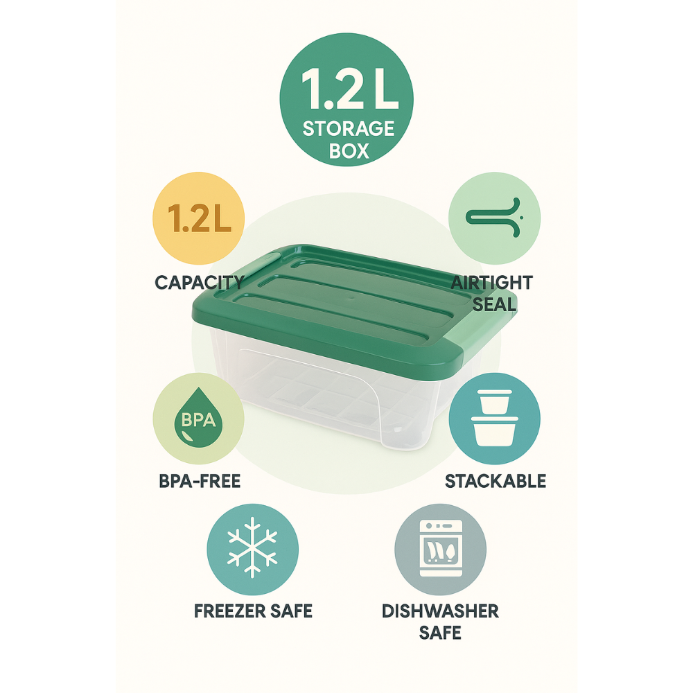 مواصفات المنتج • العلامة التجارية: عامة • الأحجام/السعات: 1.2 لتر / 5.7 لتر • المادة: بلاستيك شفاف (آمن للطعام) • مميزات خاصة: غطاء محكم الإغلاق، آمن للاستخدام في الفريزر وغسالة الأطباق • اللون: جسم شفاف مع غطاء ملون (أخضر) • بلد المنشأ: تركيا