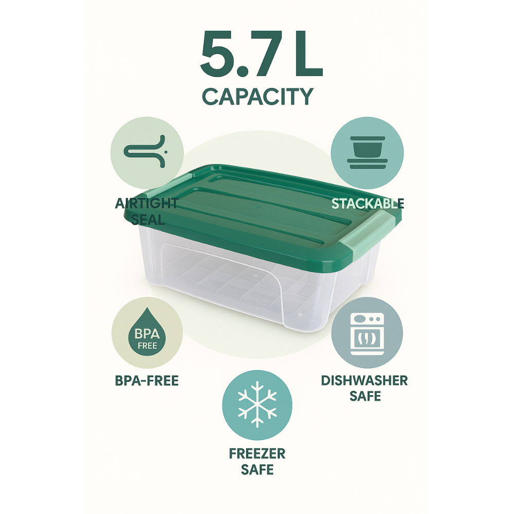الميزات الرئيسية • جسم شفاف - يمكنك رؤية المحتويات بسهولة في لمحة واحدة • غطاء محكم الإغلاق - يحافظ على النضارة في الداخل ويحافظ على الهواء في الخارج • خياران للحجم - 1.2 لتر و 5.7 لتر لتناسب احتياجات التخزين المختلفة • آمنة للاستخدام في الفريزر وغسالة الأطباق - عملية للاستخدام اليومي • تصميم قابل للتكديس - يوفر أقصى قدر من المساحة في الثلاجات أو الخزائن • مثالي لتخزين الطعام أو بقايا الطعام أو تحضير الوجبات أو تنظيم المخزن