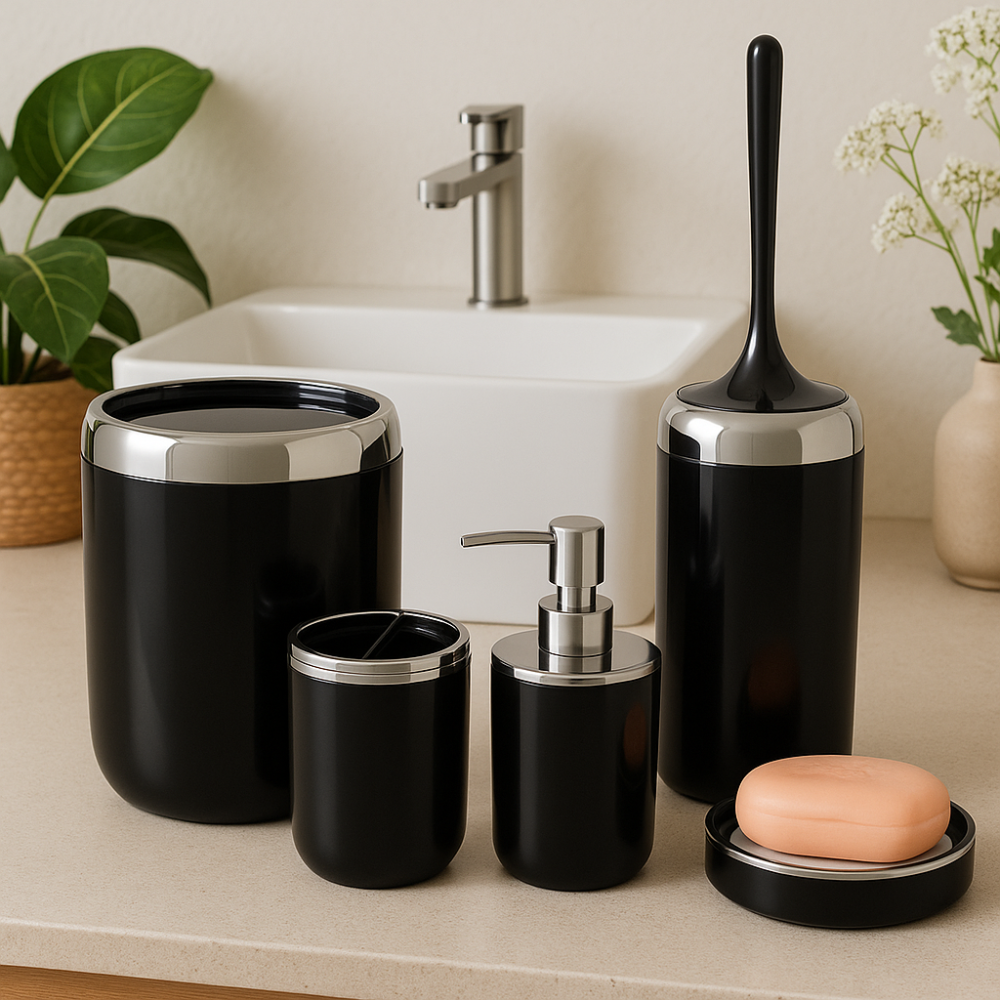 5-Piece Bathroom Accessories Set – Wood-Grain Accents, Durable Plastic