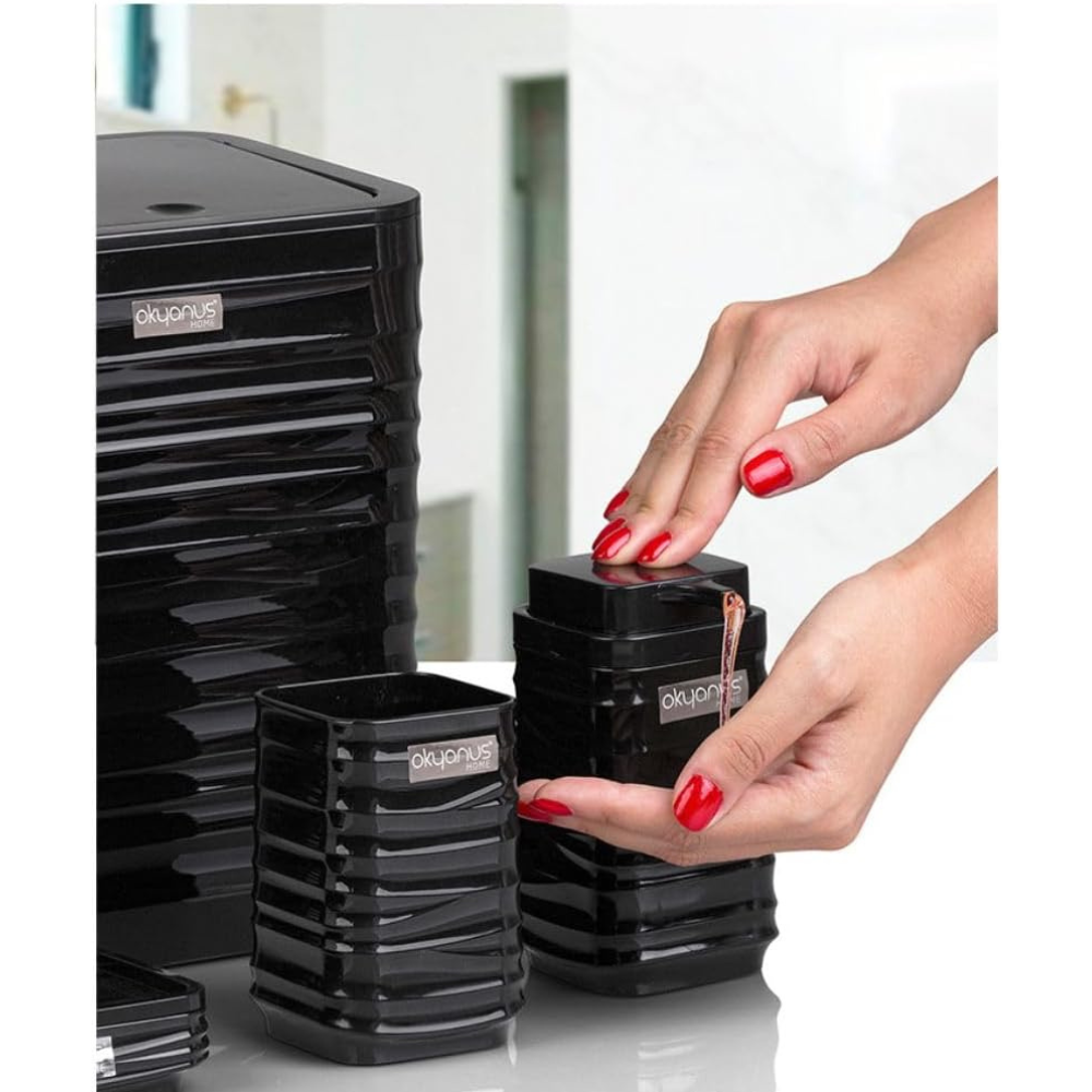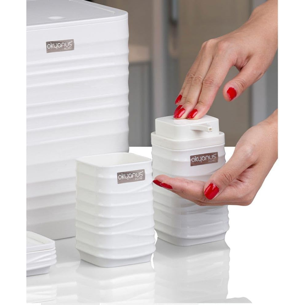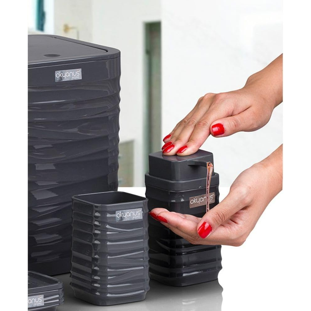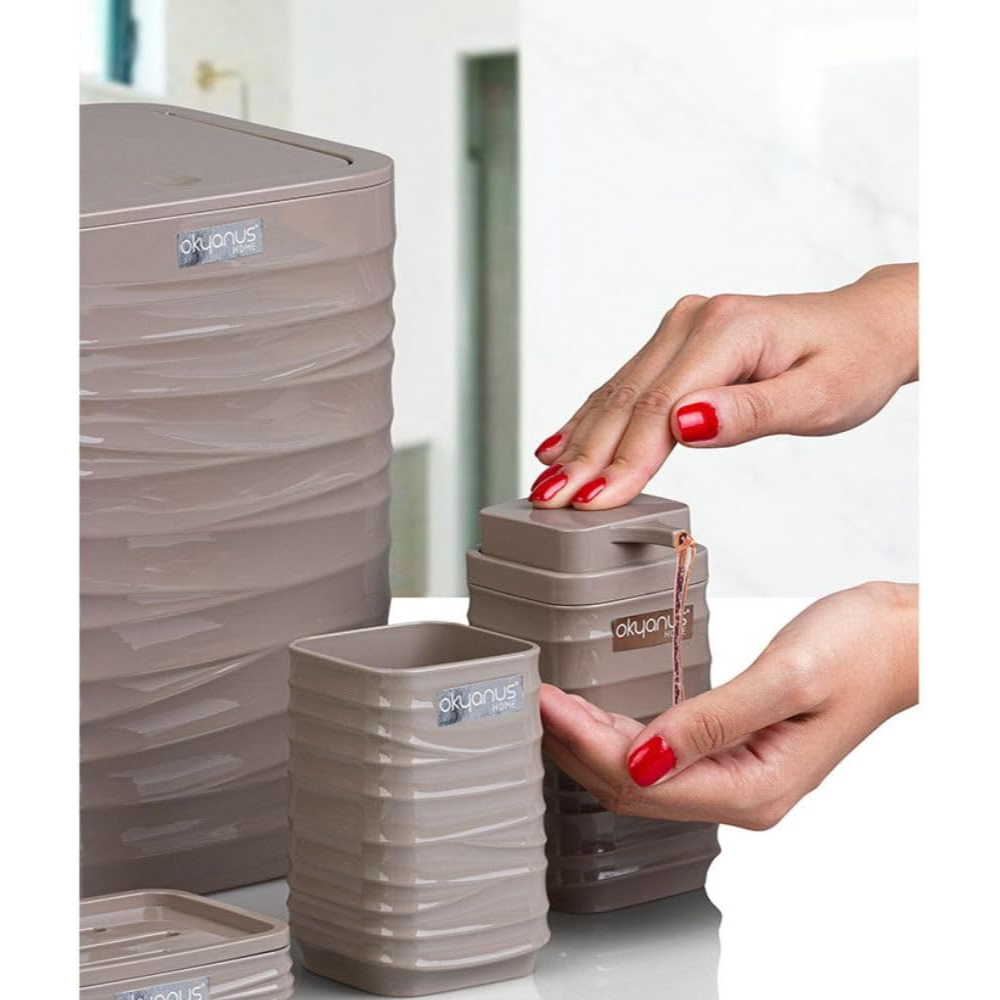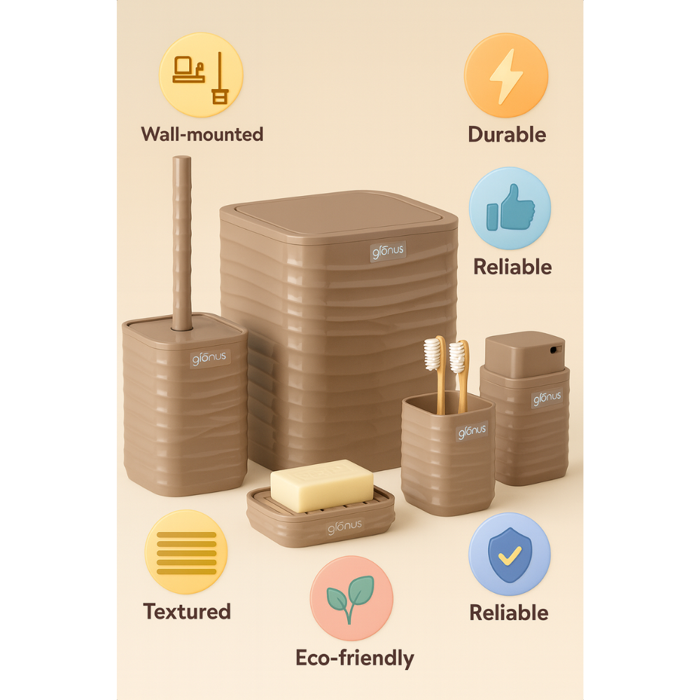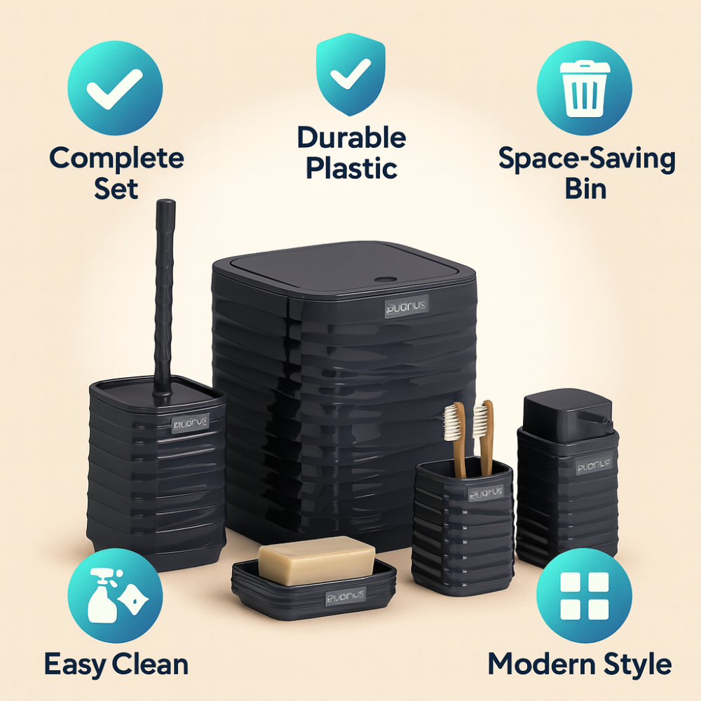 This bathroom accessories set organizes sink and floor essentials in one coordinated bundle. The glossy, rust-free plastic finish is easy to wipe clean and built for daily use. Set includes a covered waste bin, toilet brush, soap dispenser, toothbrush holder and soap dish—perfect for modern, hotel-style bathrooms. Available in Black, Gray, White and Beige to match your décor.