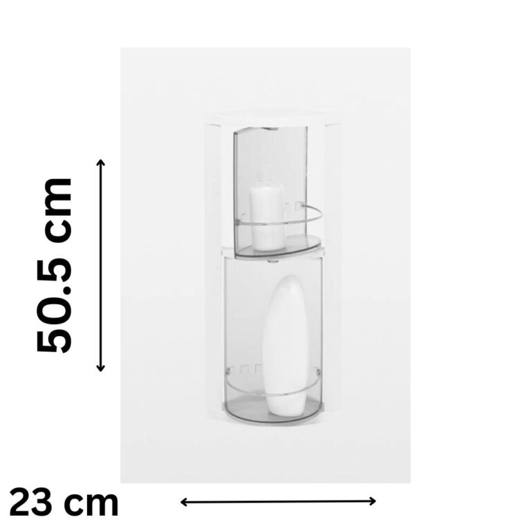 Primanova is a triple corner unit with 3 rotating shelves that hide items out of view when closed Includes 5 adhesive strips for hanging accessories.