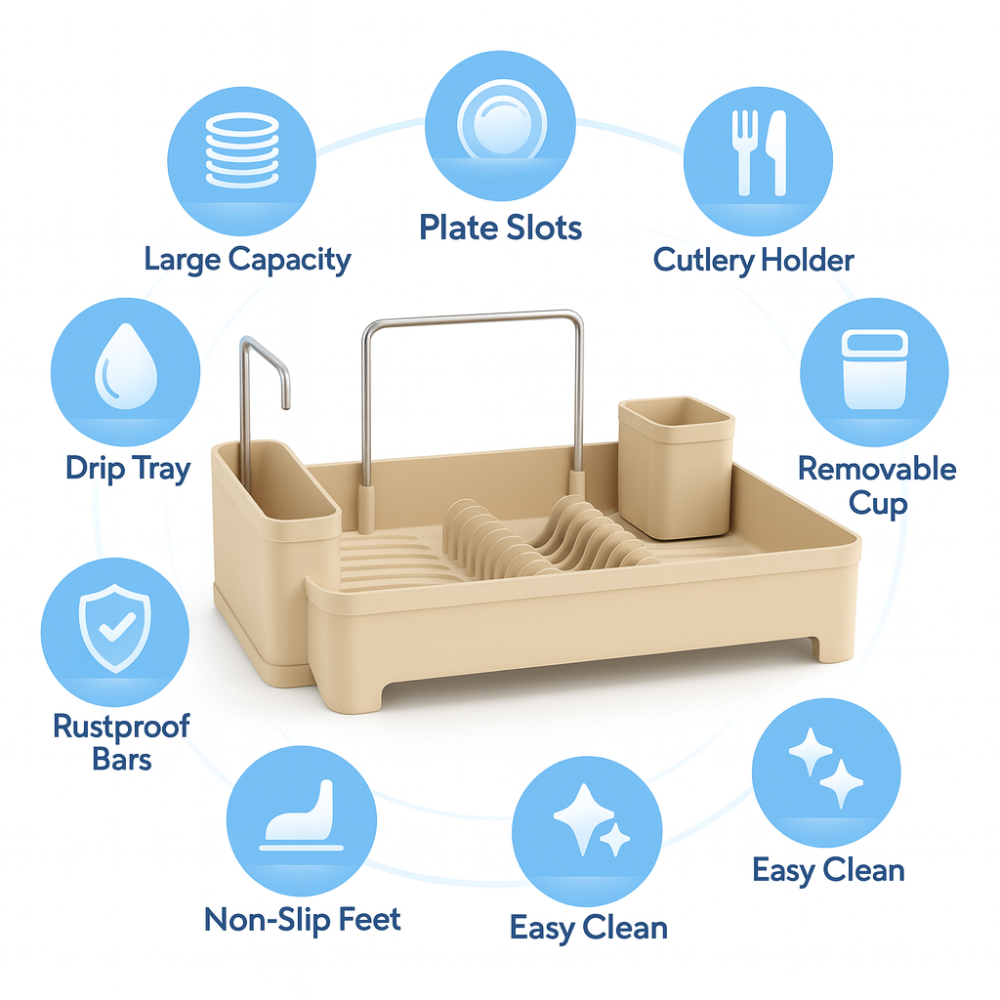 • Special Features: Adjustable drain spout, cutlery holder, support bar, non-slip feet