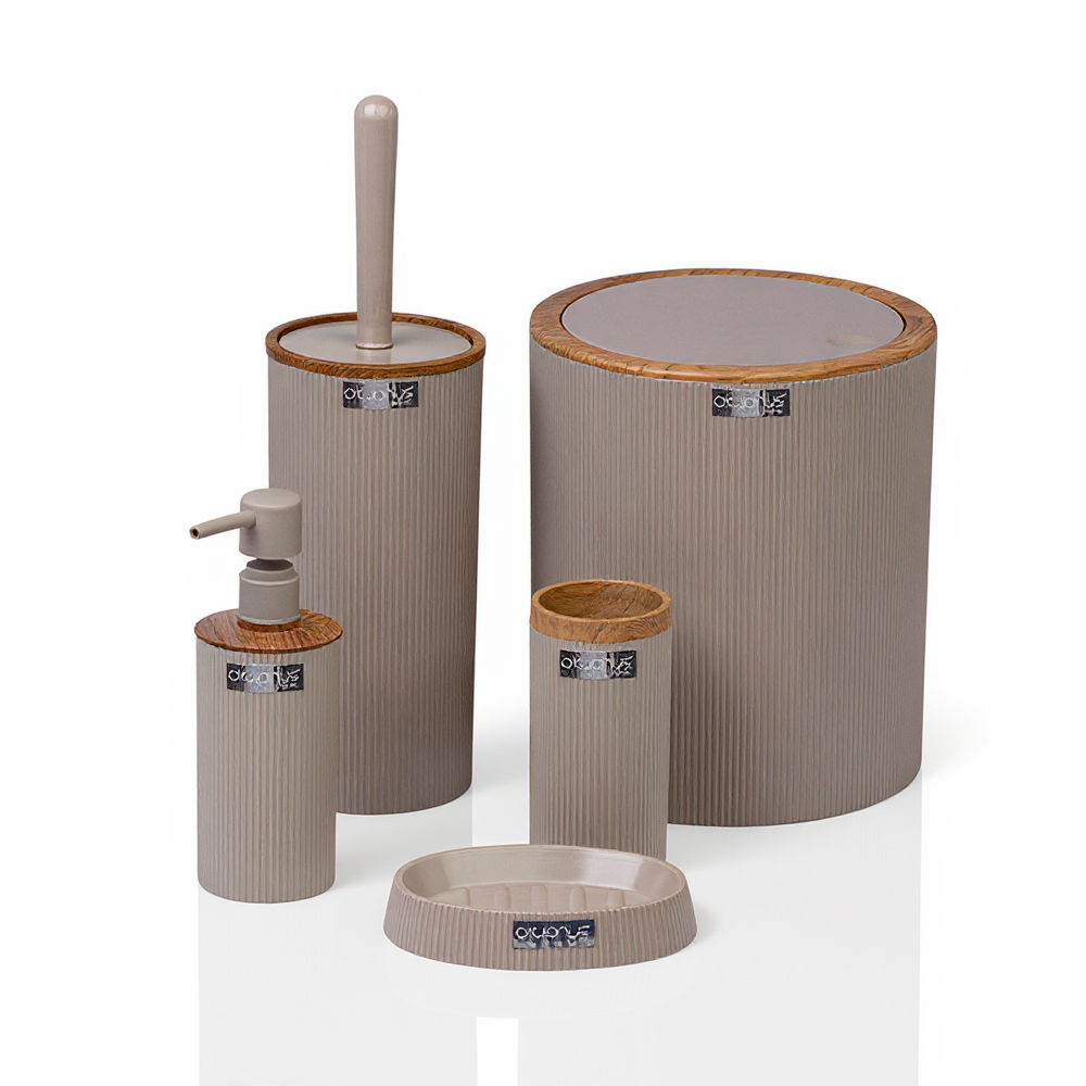 Okyanus 5-Piece Bathroom Accessory Set – Beige Ribbed Design & Wood-Style Accents